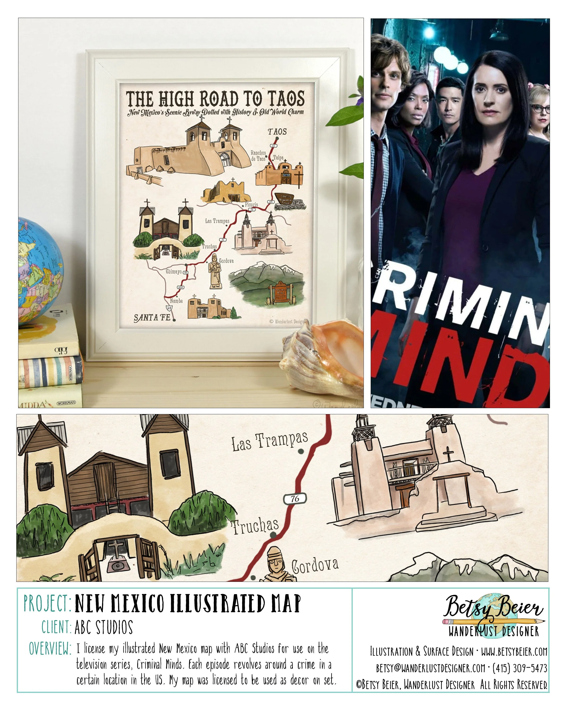 I licensed my illustrated New Mexico map with ABC Studios for use on the television series Criminal Minds. Each episode revolves around a crime committed in a different location in the US. My map was licensed to be used as decor on set.